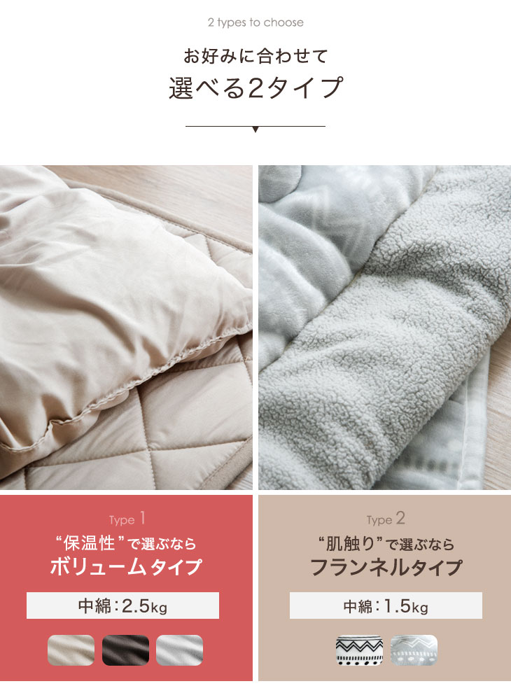 仕様 サイズ【掛布団】約240×200cm【敷布団】約240×200cm□水玉ボルドー【掛布団】約245×205cm【敷布団】約245×205cm※対応こたつサイズ:幅105〜120×奥行80〜90cm 【スタッフむったんのおすすめポイント】 ・選べる2タイプ!こたつ掛敷布団2点セット ・断熱性に優れたボリュームタイプ ・フランネル×シープ調の肌触りが心地よいフランネルタイプ ・掛布団はご自宅で洗濯可能なのでいつでも清潔 ・フローリングに敷いても安心の滑り止め付き ・床からの冷気を防ぐウレタン入敷布団 中綿重量<ボリュームタイプ>約2.5kg <フランネルタイプ>約1.5kg 素材 <ボリュームタイプ> 【掛布団】表地・裏地:ポリエステル100%※ピーチスキン加工中綿:ポリエステル綿100% 【敷布団】表地・裏地:ポリエステル100%中材:ウレタンフォーム、ポリエステル綿 <フランネルタイプ> 【掛布団】表地・裏地:ポリエステル100%中綿:ポリエステル綿100% 【敷布団】表地・裏地:ポリエステル100%中材:ウレタンフォーム、ポリエステル綿 カラー<ボリュームタイプ>ダークブラウン、ベージュ、グレー、水玉ボルドー <フランネルタイプ>モノネイチャーグレー、モノネイチャーホワイト 梱包サイズ 幅58x奥行36x高さ38cm 送料【送料無料(沖縄県・離島は送料別途)】※沖縄県・離島の場合はお問い合わせください。
