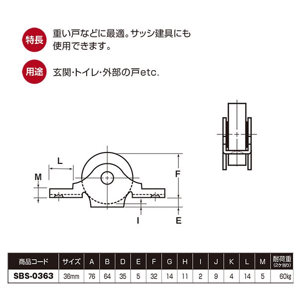 用途:玄関・トイレ・外部の戸etc.■商品スペック【仕様】車輪径D:35mm車輪幅J:9mm全長A:76mm枠幅G:14mm耐荷重(2個使用時):60kg【材質】車:ステンレス(SUS303+#608GGベアリング入)枠:ステンレス(SUS304)芯棒:ステンレス(SUS304)■送料・配送についての注意事項●本商品の出荷目安は【1 - 5営業日 ※土日・祝除く】となります。
