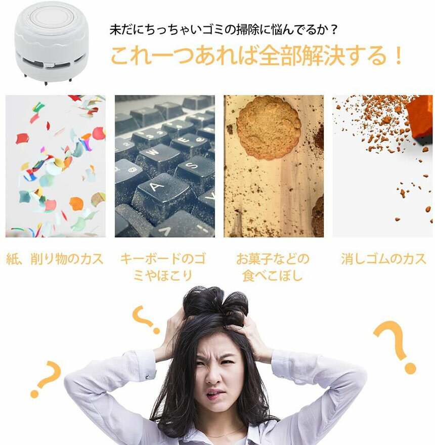 「高い実用性」コンパクトでパワフル吸引力があって、勉強と仕事時消しゴムのカス、削り物のカス、お菓子などの食べこぼし、机上のゴミやほこりやペットの毛など、事務用品としてはもちろん、玄関マット、キーボード、事務所のテーブル、家具の表面、車のクッション、座布団など掃除用具としても役立てられます。