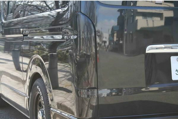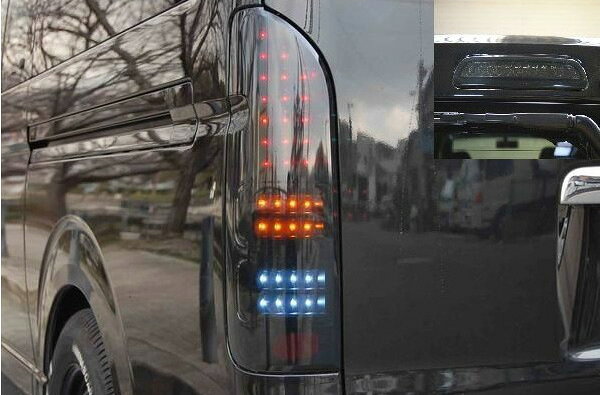 適合車種 ハイエース 200系平成16年〜24年4月(1.2.3型前期) 標準・ワイドボディー 純正ハイマントランプ装着全車 商品説明 テールランプの表面はスモークレンズでインナーがオールブラック仕様!フルLED片側36発がスモール&ブレーキ(18発)・ウィンカー(9発)・バック(9発)と輝き、とても綺麗な仕上がりになっております。