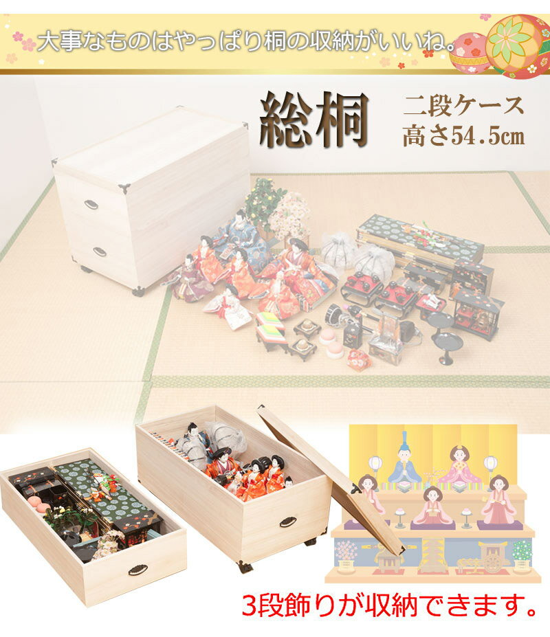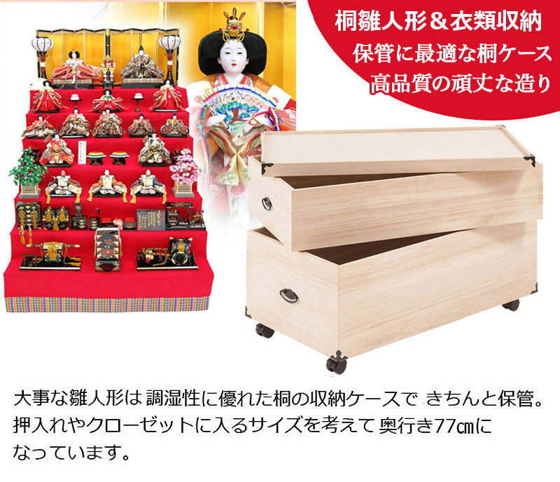雛人形 収納 2段 幅42 奥行77 高さ54.5cm 木箱 桐 収納 和風 キャスター 桐箱 クローゼット 深型 収納ケース 桐 たんす 押入れ 箱 のみ 雛人形 保管 ケース 五月人形 ひな人形 着物収納に最適 ロータイプのキャスター付き収納
