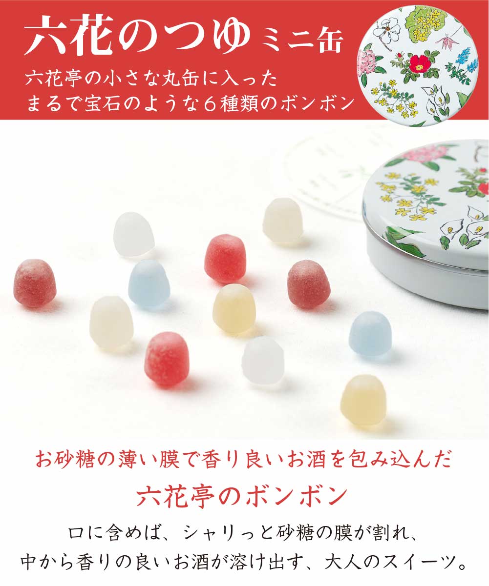 「六花のつゆ ミニ缶」はお砂糖の薄い膜で香り良いお酒を包み込んだ6種類のボンボン。