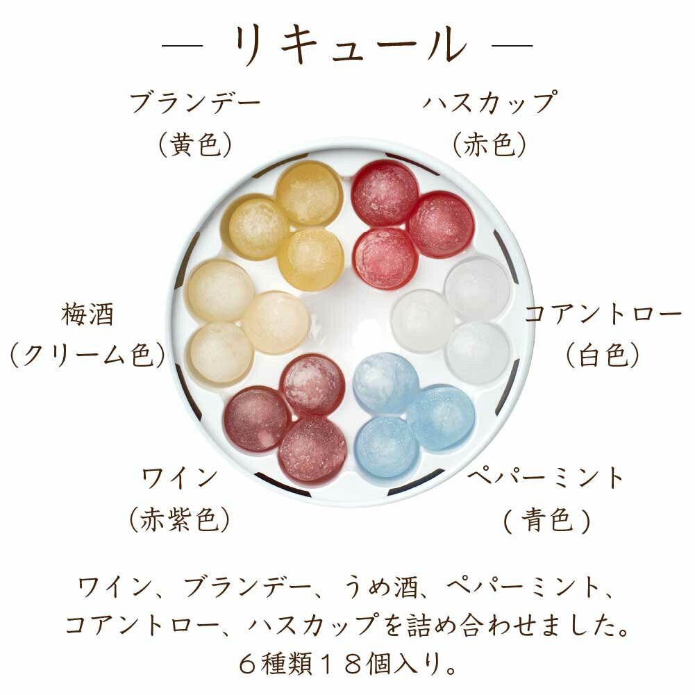 ワイン、ブランデー、うめ酒、ペパーミント、コアントロー、ハスカップの6種類を詰め合わせました。