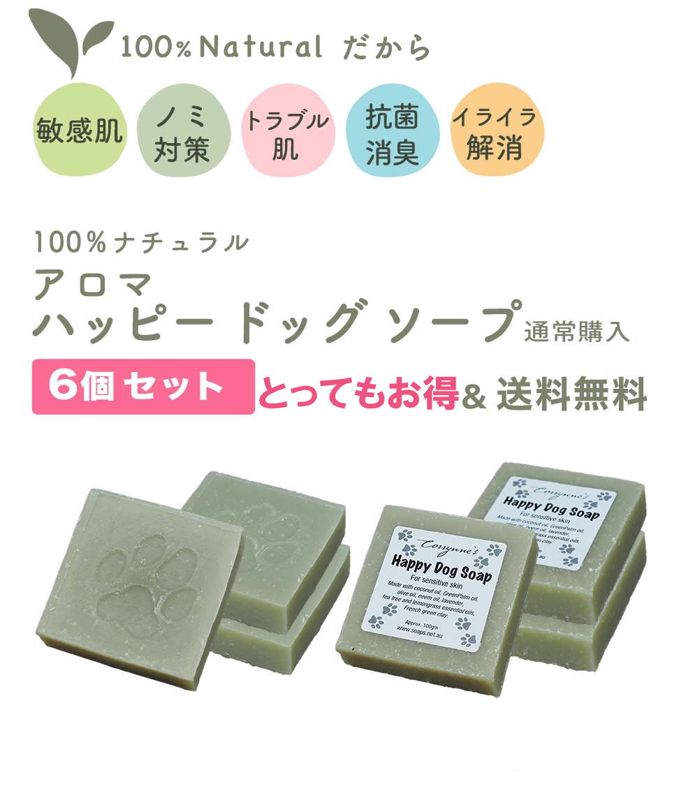 たっぷり泡立ちすすぎもササッ! 舐めても安心、低刺激です 送料無料 [10%OFF! 6個組]アロマハッピードッグソープ オーガニック ペット用シャンプー 犬用石鹸 犬用シャンプー 敏感肌・乾燥肌 肌荒れ ティーツリー ペットシャンプー 犬猫兼用 無添加 洗浄力高い ハッピードッグソープは最初、石鹸メーカーの社長さんが、市販の犬用シャンプーを嫌がる、肌の弱い愛犬のために作った犬用シャンプーです。