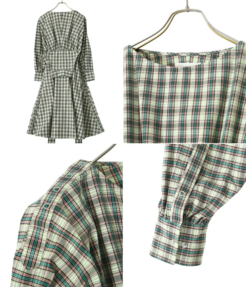 商品詳細 【デザイン】 ・トラディショナルなタータンチェックを違和感のある配色でモダンに解釈した柄 ・丈と見頃のデザインの変化を楽しめる2wayドルマンドレス ・横の中綴じを利用して丈が変化するデザイン 【素材】 ・しっかりとした肉感のあるタータンチェックオックスフォード ・希少性の高い超長綿の柔らかさ、膨らみを楽しめる素材 ・ケミカルな加工をあえて行わない仕上げ工程 ・原綿のもつナチュラルな風合いを目指したシャツ地 【サイズ感・シルエット】 ・膝下丈のウエスト切り替えドルマンスリーブドレス ・ウエスト切り替え下のヨークを引き上げると膝上丈のオフショルダードレスに変化 MATERIAL コットン100% SIZE 36 / 着丈:109cm 裄丈:77cm ウエスト:71cm ※個体によって多少の誤差が生じる場合があります。