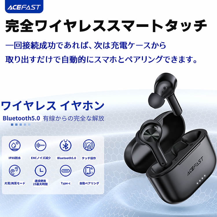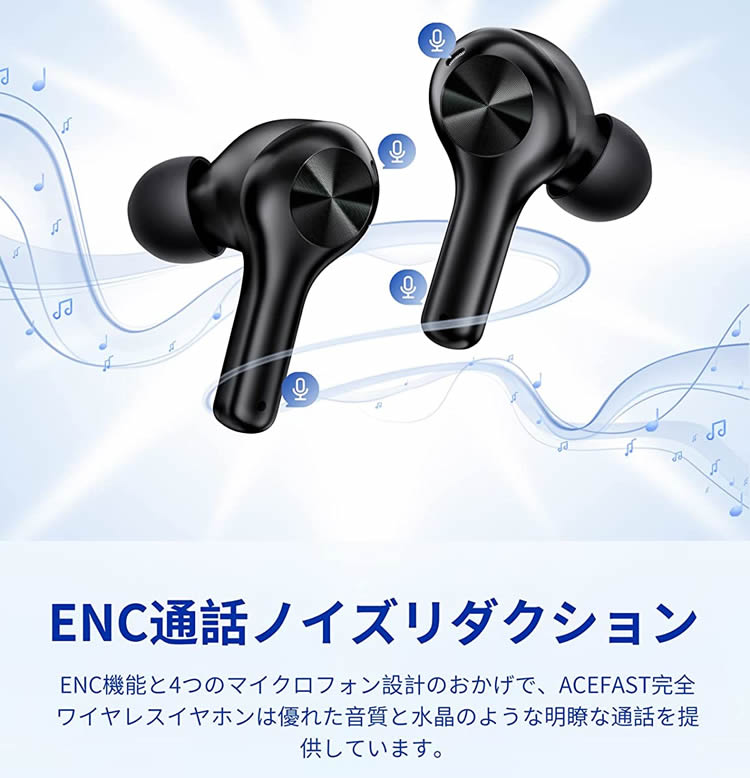 【検索用キーワード】 ACEFAST ワイヤレスイヤホン Bluetooth イヤホン マイク4本内蔵 ハンズフリー通話 Bluetooth 5.0 自動ペアリング 瞬時接続 IPX6防水 siri対応 左右分離型 片耳/両耳 Type‐C充電対応 ブルートゥースワイヤレス TELEC認証済 iPhone/Android対応 技適 ACEFAST ワイヤレスイヤホン Bluetooth イヤホン マイク4本内蔵 ENC通話ノイズキャンセリング ハンズフリー通話 Bluetooth 5.0 自動ペアリング 瞬時接続 IPX6防水 siri対応 左右分離型 片耳/両耳 最大25時間音楽再生 Type‐C充電対応 ブルートゥースワイヤレス TELEC認証済 iPhone/Android対応ACEFAST ワイヤレスイヤホン Bluetooth イヤホン マイク4本内蔵 ハンズフリー通話 Bluetooth 5.0 自動ペアリング 瞬時接続 IPX6防水 siri対応 左右分離型 片耳/両耳 Type‐C充電対応 ブルートゥースワイヤレス TELEC認証済 iPhone/Android対応 商品詳細 【ENC通話ノイズリダクション】 ENC機能と4つのマイク設計のおかげで、ACEFAST完全ワイヤレスイヤホンは優れた音質と水晶のように明瞭な通話を提供しています。